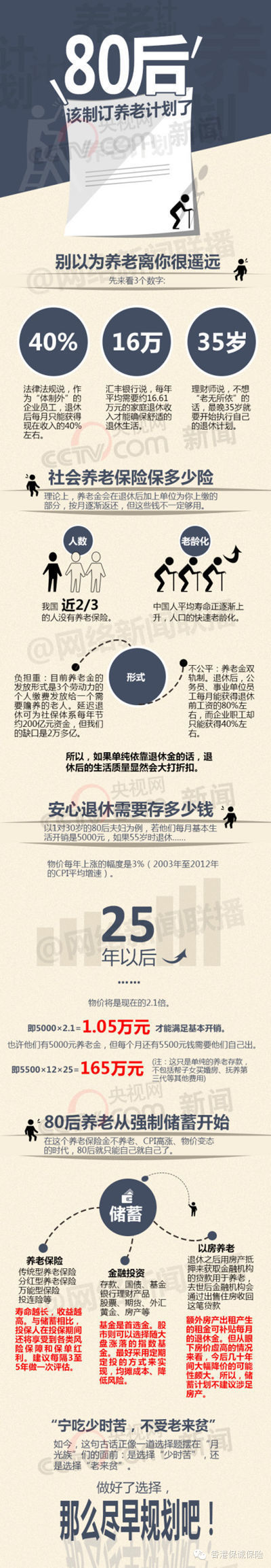9月23日,《中国老龄产业发展报告(2014)》发布。它里面说了这么些数字,与你息息相关。 “2022到2030年为我国人口老龄化急速发展阶段,届时60岁及以上老人由2.6亿增长到3.7亿。2050年,我国将成为世界上老年人口最多的国家。” 那个年代刚好是——80后老了。 最早的一批80后,即将迈入35岁。理财师的说法是,不想“老无所依”的话,最晚35岁就要开始执行自己的退休计划。 所以,你还没有危机感吗? 但实际上,因为很多原因,大部分80后并未开始制定自己的“养老计划”。2012年,潇湘晨报联合大湘网做了针对80后的“中国式养老”网络调查。84.92%的受访者表示,现在没有为自己制订养老计划,其中因为是“车奴+房奴+孩奴”没资本考虑养老的占41.78%,还有三成受访者觉得“对未知充满恐惧感,计划赶不上变化”。 2014年初,上海财经大学高等研究院的对此做了研究。得出的结论是:现在在职的一代人需要更努力地工作,才能确保30年后的养老水平。因为一旦退休,其平均工资就被固定在过去较低的数额,随着经济和社会发展,其养老收入的总体水平肯定越来越低。所以,80后提早做计划是十分必要的。 如果你现在的年龄越小,面临的通胀时间就越长,到时候需要准备的退休金将更多。如果你对生活水平要求更高的话,自然也要更多的钱。 如果你是城镇企业员工,参加了城镇基本养老保险,公司给你缴纳20%的养老基金,进入统筹账户,你自己缴纳8%,进入个人账户。那么退休后可以拿到多少钱呢? 公务员和事业单位人员 企业在职员工 第一招:10%用于投资 “10%法则”是指把收入的10%拿来投资,积少成多,积腋成裘,将来就有足够的资金应付理财需求。例如你每个月有3000元收入,那么就每月挪出300元存下来或投资,一年可存3600元。每个月都拨10%投资,经年累月下来,可以储备不少资金。 第二招:区分投资与消费 如