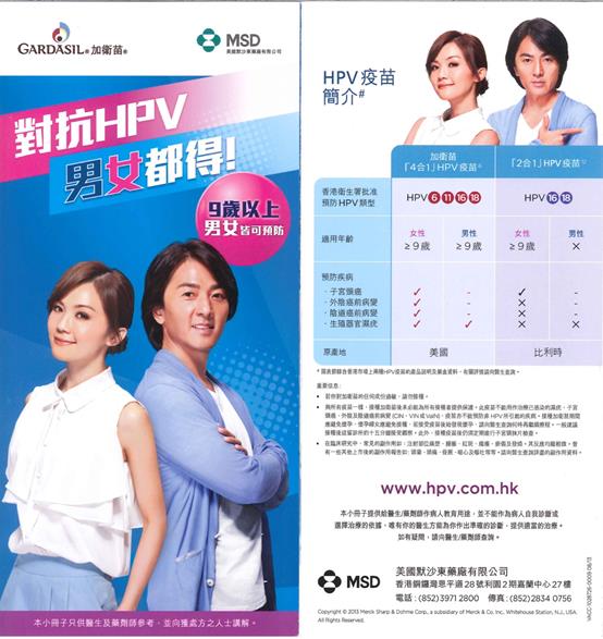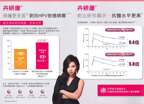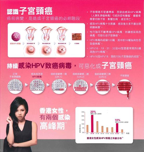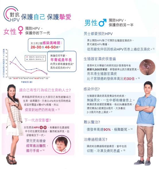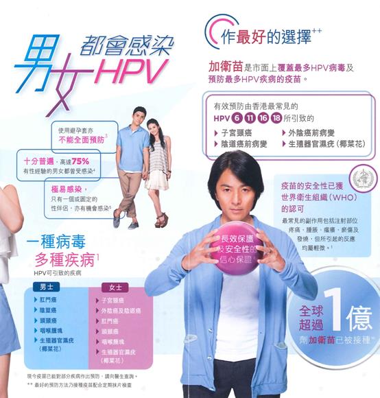 一、认识HPV病毒 子宫颈癌不是遗传病,而是由持续感染高危致癌型HPV病毒(人类乳头瘤病毒)所引起的恶性肿瘤。严重者需要切除子宫,影响到生育,甚至死亡。宫颈癌是全球女性的第二大癌症杀手。(梅艳芳就是死于宫颈癌) HPV病毒主要透过性行为传播,即使安全性行为(使用安全套)亦不能完全预防。HPV病毒十分普遍,可引致男性尖锐湿疣(椰菜花),也会男女交叉感染。 二、什么是HPV 疫苗? 香港批准注册HPV疫苗为卉妍康(Cervarix)和加卫苗(Gardasil),必须按医生建议下才可以接种。简单的来说,卉妍康是邓紫棋代言的,只有女性可以打;加卫苗是阿sa和郑伊健代言的,男女都可以打。